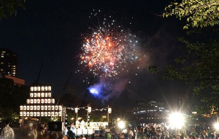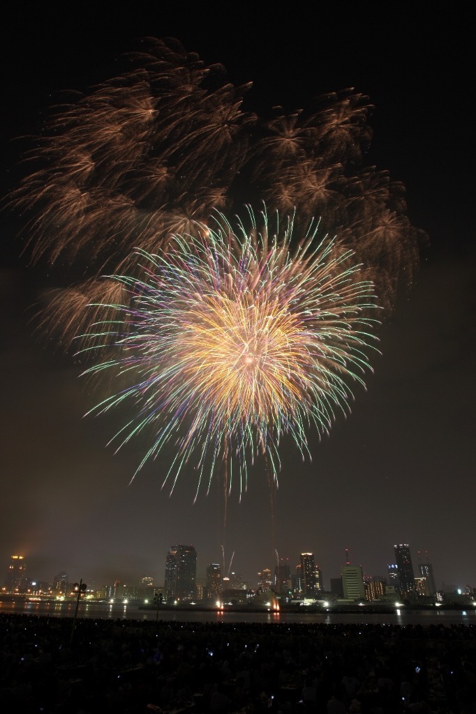 淀川の十三側から観客は花火を観る形で、打揚げ場所は対岸の中津側のグランド。