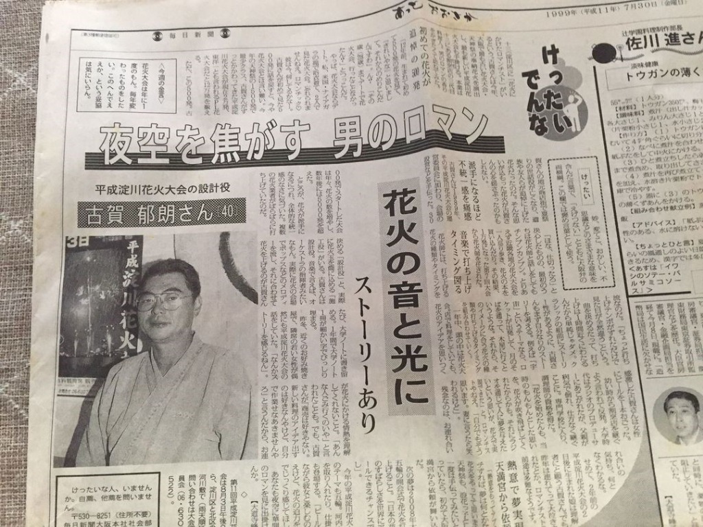 平成11年 天神祭り奉納花火に関わったということで毎日新聞の記事になりました。当時の状況そのものです。